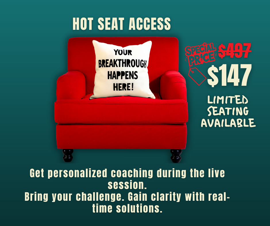 Each seat offers direct access to personalized coaching in a small-group setting. You’ll not only gain clarity from your own session but insight from the breakthroughs of others.